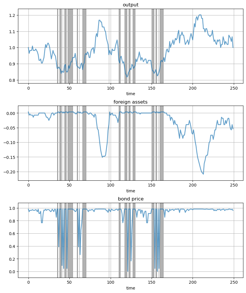 The grey vertical bars correspond to periods when the economy is excluded from financial markets because of a past default.