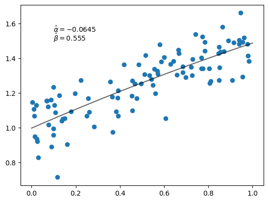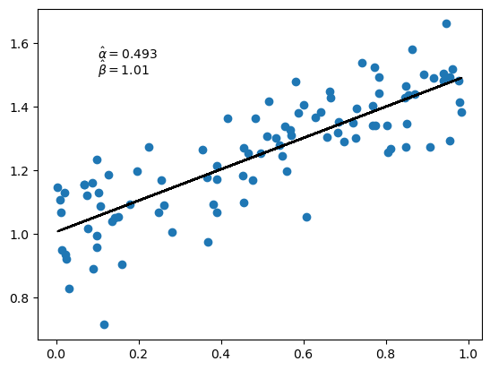 ax.text(0.1, 1.50, rf'$\hat \beta = {β_hat:.3}$')