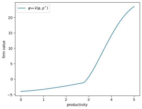 The firm makes their stop-continue choice by first solving for the value function, which is the unique solution in a class of continuous functions \(\mathscr C\) (details omitted) to