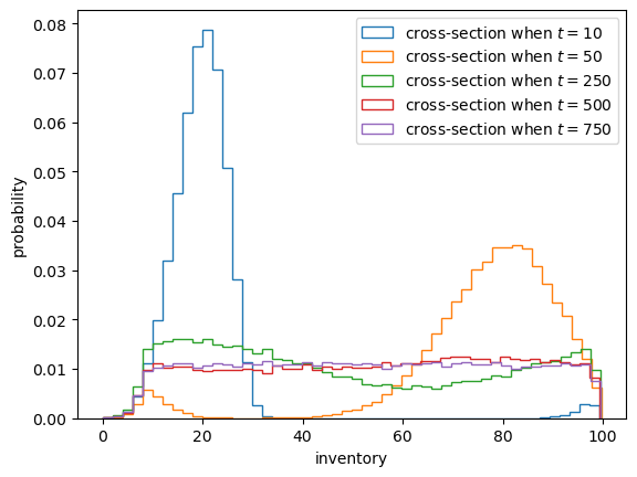 By \(t=500\) or \(t=750\) the distributions are barely changing.