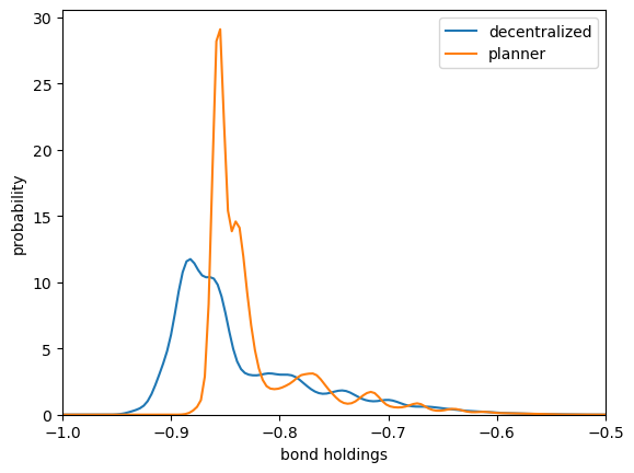 generate_borrowing_sequenceplusH_eqandH_planto calculate bond holdings for the planner and the decentralized equilibriumproduce a kernel density plot for each of these data sets