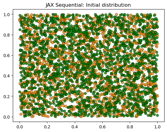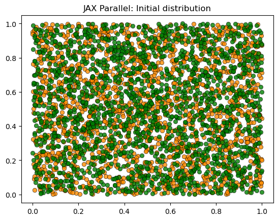plot_distribution(locations, types, 'JAX Parallel: Initial distribution')