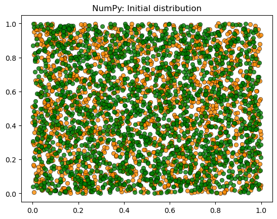 plot_distribution(locations, types, 'NumPy: Initial distribution')